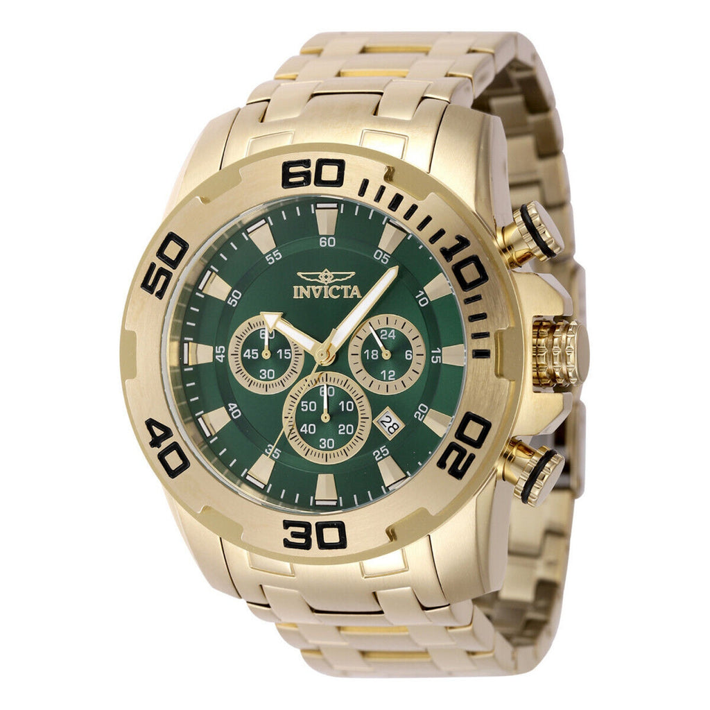 Its face displays a green, brass dial protected by a highly resistant Mineral Crystal.