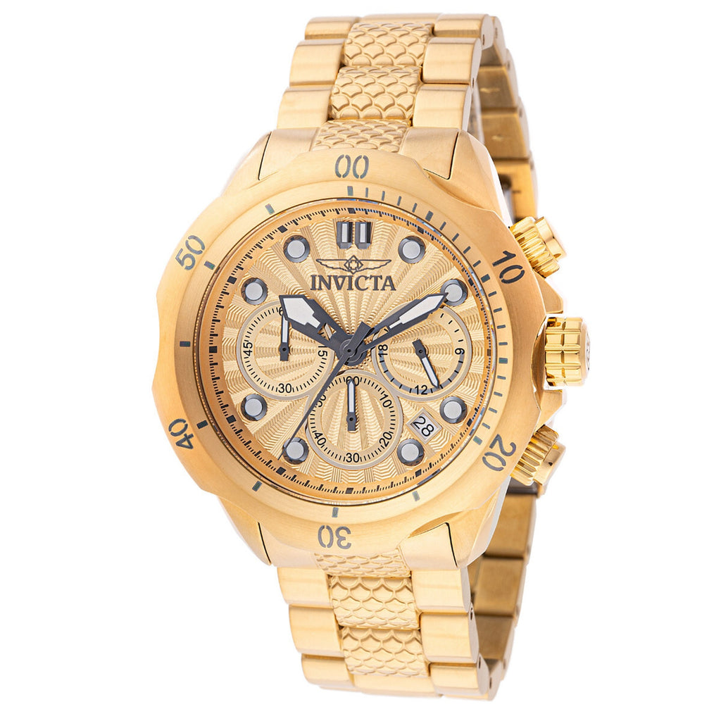 This stunning Invicta Venom watch features a precise quartz movement housed in a striking gold-tone case. The gold metal dial is shielded by a durable mineral crystal, ensuring long-lasting clarity and protection. A matching gold-tone band completes the bold look, while water resistance up to 100 meters makes it as functional as it is stylish.